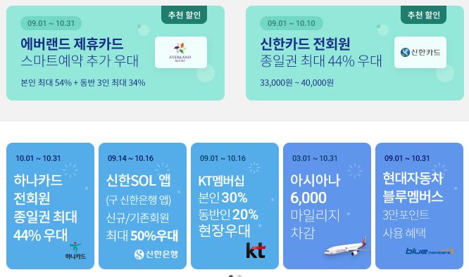 또, 스페셜 프로모션 기간으로 에버랜드 제휴카드로 스마트 예약 추가 혜택이 있는데, 본인 최대 54%, 동반 3인 최대 34%까지 할인하는 프로모션이 있다. 또, 신한카드/하나카드 전회원에게 종일권 최대 44% 할인을 적용하는 등 스페셜 프로모션이 있으니 꼭! 꼭! 확인해서 할인을 받는 것이 좋겠다.